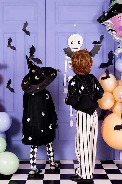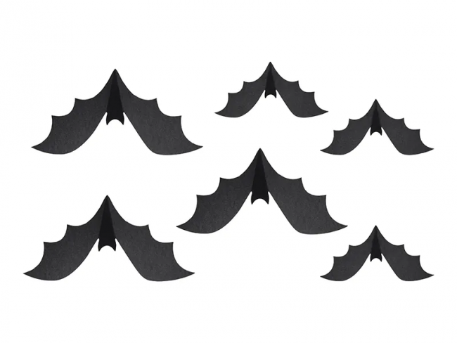 Mustat paperilepakot 6kpl/pkt. pakkauksessa kahta eri kokoista lepakkoa joiden koko 29x13,3 ja 19x8,7cm. Taita lepakot muotoonsa ja laita tarra lepakon keskustaan ja kiinnitä seinälle.